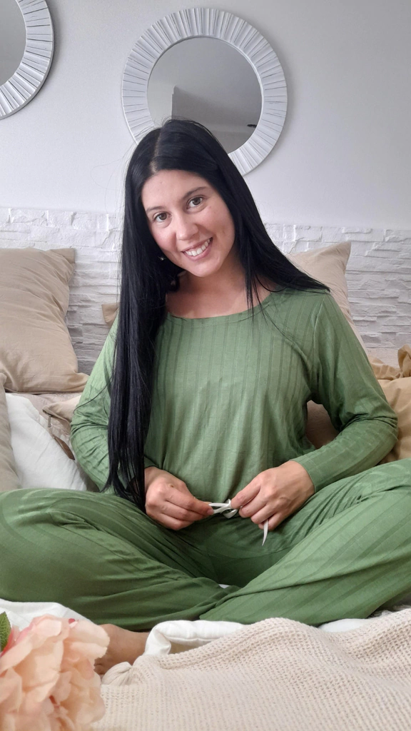 Conjunto de pijama remera manga larga y pantalón con elástico en la cintura y cinta de raso.